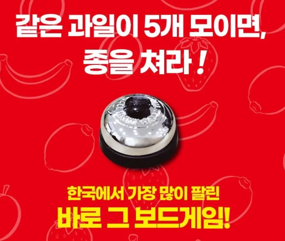 루미큐브가 전략게임이라면 할리갈리는 단순한 게임 규칙으로 누구나 쉽게 할 수 있는 게임이에요 필드위에 카드 더미를 계속 올리다가 같은 과일이 5개가 모이면 종을 치고 쌓인 카드더미를 가져가면 되는 게임이에요 단순하지만 은근히 눈치를 보는 재미가있는 게임입니다.